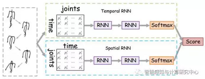 由于深度传感器的成本的降低和实时的骨架估计算法的出现,基于骨架的行为识别研究越来越受欢迎。传统方法主要基于手工特征设计,对行为中运动的表达能力有限。最近出现了一些基于循环神经网络的算法,可以直接处理原始数据并预测行为。这些方法只考虑了骨架坐标随着时间的动态演变,而忽略了它们在某一个时刻的空间关系。在本文中,我们提出一种基于双流循环神经网络的方法如图三,分别对骨架坐标的时间动态特性和空间相对关系建模。对于时间通道,我们探索了两种不同的结构:多层循环神经网络模型和层次化的循环神经网络模型。对于空间通道,我们提出两种有效的方法把坐标的空间关系图转换为关节点的序列,以方便输入到循环神经网络中。为了提高模型的泛化能力,我们探究了基于三维坐标变换的数据增强技术,包括旋转、缩放和剪切变换。 在深度视频的行为识别标准数据库的测试结果显示,我们的方法对于一般行为,交互式行为和手势的识别结果都有相当大的提高。