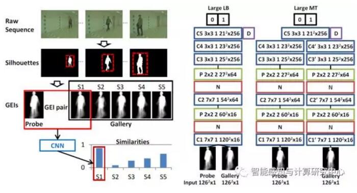 基于行走行为的身份识别,即步态识别一般指的是给定一个步态序列,要求从一个匹配库中找出与之最相似的序列,从而确定所给定序列中人的身份。步态是远距离、非受控情况下唯一可感知的生物特征,使用范围可远达50米,在远距离大范围的视觉监控场合具有不可替代的应用前景和研究价值。我们提出的方法处理的是预先提取好的步态能量图(Gait Energy Images,GEI),步态能量图是将视频序列中提取出的行人剪影对齐后沿时间维度平均得到的一种2D的灰度图像。首先,考虑到基于步态能量图的步态识别中局部细节差异的重要性,多点的局部比较应该会优于一次全局比较;其次,两个处于不同视角的样本可能会在表观上出现巨大的差异,如果只考虑比较单元自己的局部区域,将很难捕捉到足够的信息进行比较;另外还需要判别式地学习特征和比较模型。以上的三点都可以在一个深度卷积神经网络中实现,从而我们提出了基于上下文的跨视角步态识别方法如图六所示,在极为困难的同时跨视角和行走状态的任务中,也能够达到足够让人接受的识别效率。